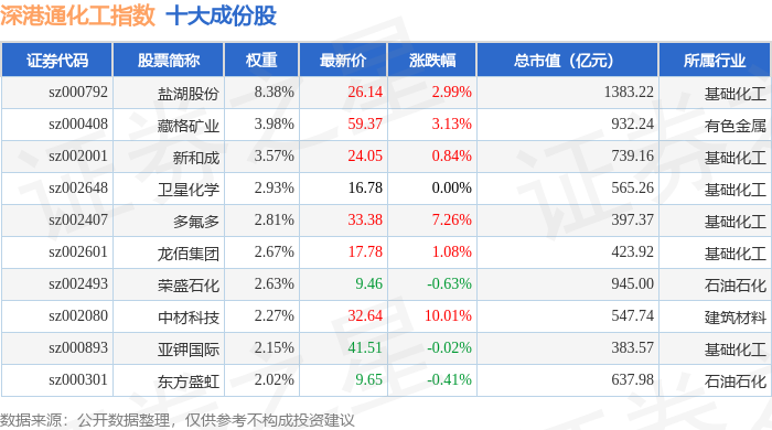 证券之星消息,11月25日,深港通化工(983063)指数报收于5718.2点,涨1.5%,成交460.94亿元,换手率2.2%。当日该指数成份股中,上涨的有82家,中材科技以10.01%的涨幅领涨,下跌的有28家,国风新材以4.61%的跌幅领跌。