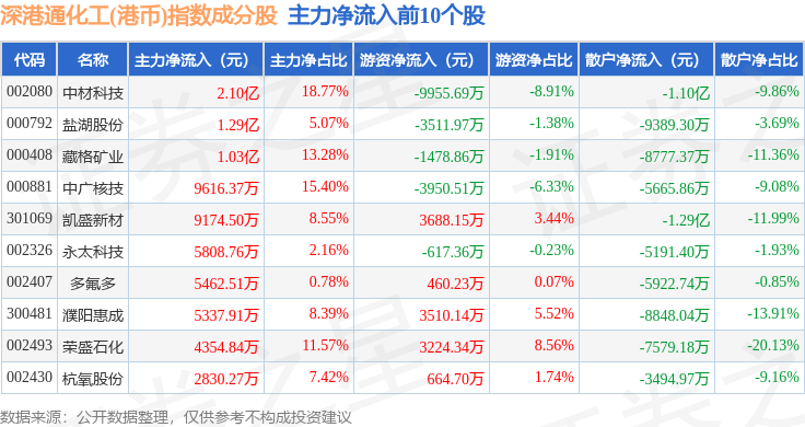 资金流向方面,深港通化工(港币)(983064)指数成份股当日主力资金净流入合计2.46亿元,游资资金净流入合计2.11亿元,散户资金净流出合计4.57亿元。成份股资金流向详情见下表: