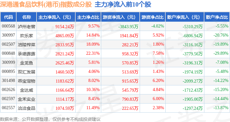 资金流向方面,深港通食品饮料(港币)(983066)指数成份股当日主力资金净流入合计2.1亿元,游资资金净流入合计1.01亿元,散户资金净流出合计3.11亿元。成份股资金流向详情见下表: