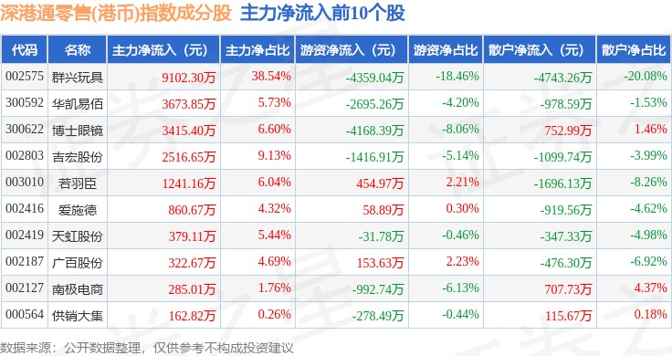 资金流向方面,深港通零售(港币)(983074)指数成份股当日主力资金净流入合计1.19亿元,游资资金净流出合计1.38亿元,散户资金净流入合计1899.66万元。成份股资金流向详情见下表: