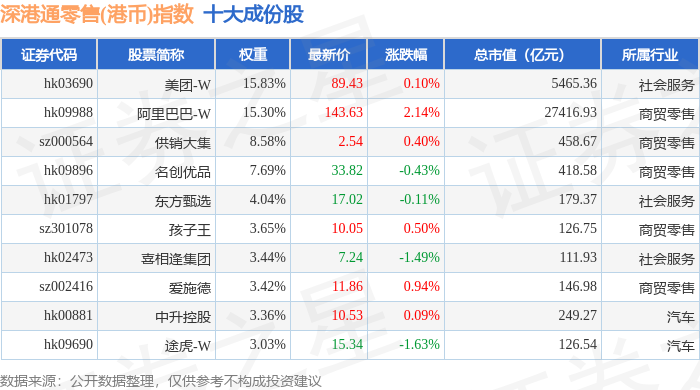 深港通零售(港币)(983074)指数十大成份股详情如下: