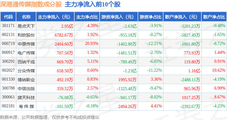 资金流向方面,深港通传媒(983075)指数成份股当日主力资金净流出合计29.74亿元,游资资金净流入合计6.91亿元,散户资金净流入合计22.83亿元。成份股资金流向详情见下表: