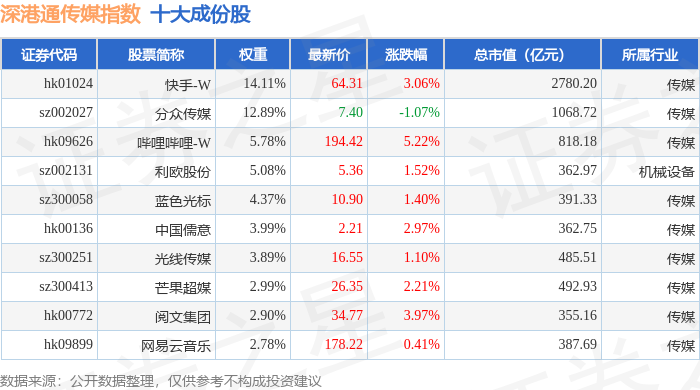 证券之星消息,11月25日,深港通传媒(983075)指数报收于2227.97点,涨1.04%,成交640.08亿元,换手率4.95%。当日该指数成份股中,上涨的有31家,易点天下以6.55%的涨幅领涨,下跌的有12家,汇量科技以10.09%的跌幅领跌。