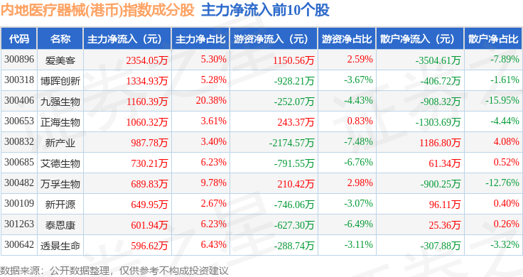 资金流向方面,内地医疗器械(港币)(983104)指数成份股当日主力资金净流出合计7537.48万元,游资资金净流出合计2481.67万元,散户资金净流入合计1.0亿元。成份股资金流向详情见下表: