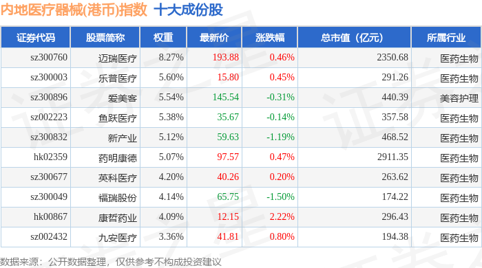 内地医疗器械(港币)(983104)指数十大成份股详情如下: