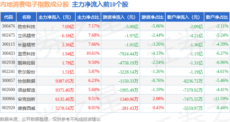 资金流向方面,内地消费电子(983105)指数成份股当日主力资金净流入合计24.0亿元,游资资金净流出合计10.89亿元,散户资金净流出合计13.11亿元。成份股资金流向详情见下表: