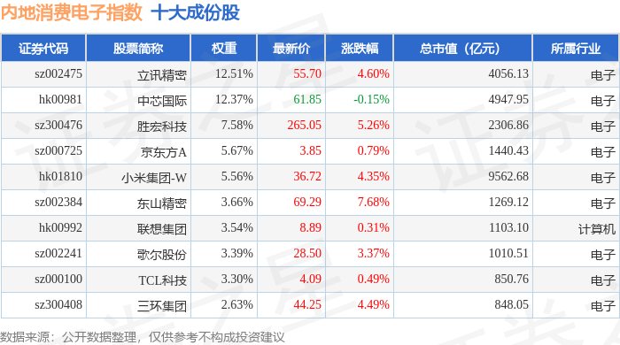 证券之星消息,11月25日,内地消费电子(983105)指数报收于4518.39点,涨2.36%,成交732.12亿元,换手率1.46%。当日该指数成份股中,上涨的有46家,东山精密以7.68%的涨幅领涨,下跌的有4家,光弘科技以1.38%的跌幅领跌。