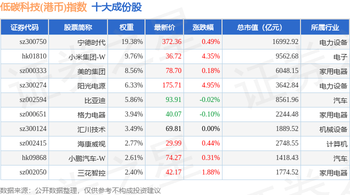 低碳科技(港币)(983161)指数十大成份股详情如下: