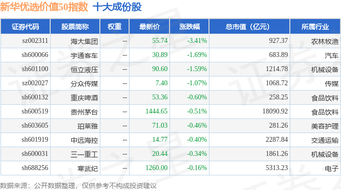 证券之星消息,11月25日,新华优选价值50(989004)指数报收于2097.73点,涨0.96%,成交1610.87亿元,换手率0.93%。当日该指数成份股中,上涨的有33家,思源电气以5.27%的涨幅领涨,下跌的有15家,海大集团以3.41%的跌幅领跌。