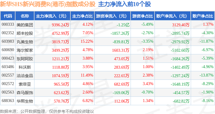 资金流向方面,新华SHS新兴消费R(港币)(489007)指数成份股当日主力资金净流出合计4.61亿元,游资资金净流入合计1.37亿元,散户资金净流入合计3.24亿元。成份股资金流向详情见下表: