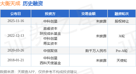 证券之星消息,根据天眼查APP于11月16日公布的信息整理,西安大衡天成信息科技有限公司股权转让融资,交易额未披露。