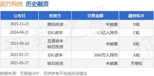 证券之星消息,根据天眼查APP于11月23日公布的信息整理,深圳拓竹科技有限公司D轮融资,融资额未披露,参与投资的机构包括腾讯投资,投后估值100亿美元。