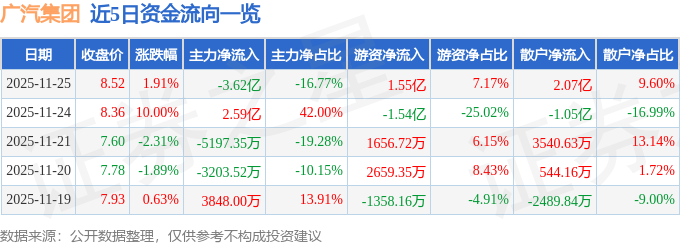证券之星消息,截至2025年11月25日收盘,广汽集团(601238)报收于8.52元,上涨1.91%,换手率3.37%,成交量248.58万手,成交额21.56亿元。