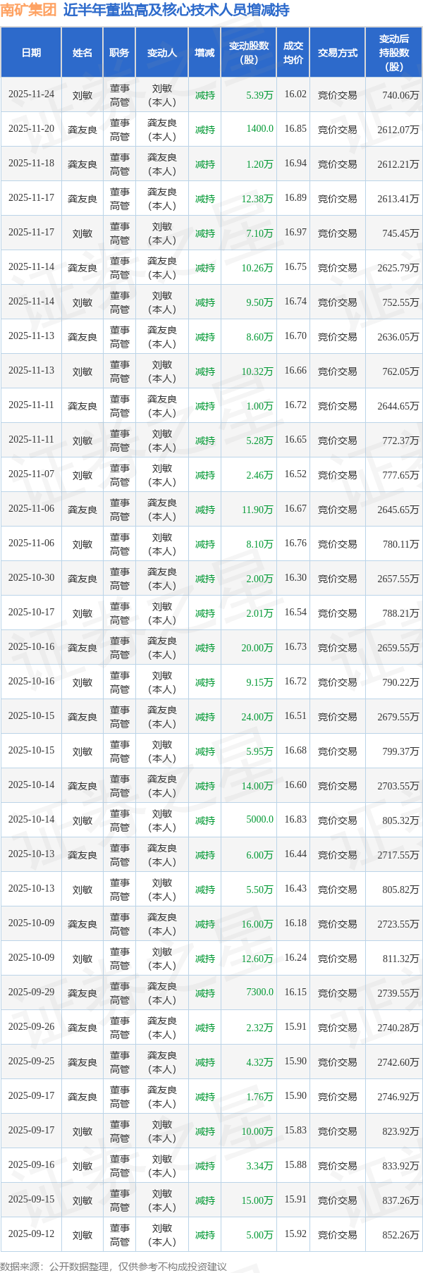 南矿集团近半年内的董监高及核心技术人员增减持详情如下: