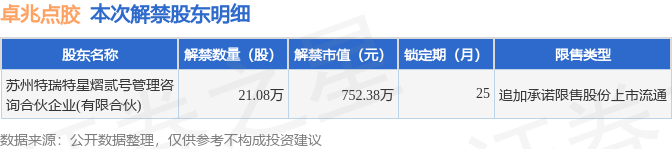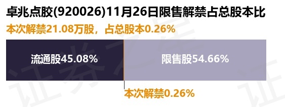 证券之星消息,根据市场公开信息整理,卓兆点胶(920026)于11月26日将有21.08万股限售股份解禁,为公司追加承诺限售股份上市流通,占公司总股本0.26%。(本次数据根据历史公告整理得出,实际情况以上市公司最新公告为准)最近一年内,该股累计解禁2326.3万股,占总股本的28.34%。本次解禁后,公司还有4486.26万股限售股份,占总股本54.66%。具体如下图所示: