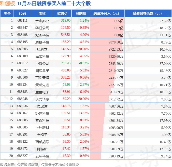 科创板融资净买入前三分别为:金山办公(688111)融资净买入1.05亿元、华虹公司(688347)融资净买入1.02亿元、源杰科技(688498)融资净买入1亿元,前20具体见下表: