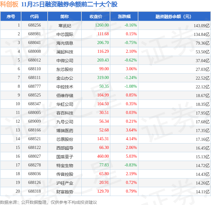 科创板融资融券余额前三分别为:寒武纪(688256)融资融券余额143.09亿元、中芯国际(688981)融资融券余额134.84亿元、海光信息(688041)融资融券余额79.36亿元,前20具体见下表: