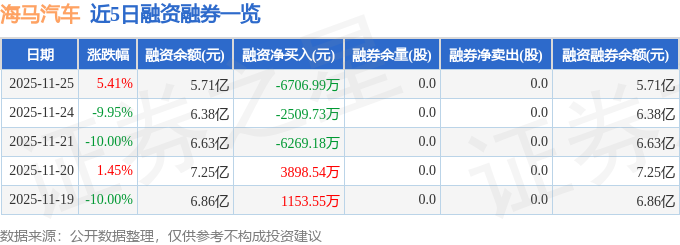 海马汽车融资融券信息显示,融资方面,当日融资买入2.16亿元,融资偿还2.83亿元,融资净偿还6706.99万元。融券方面,融券卖出0.0股,融券偿还0.0股,融券余量0.0股,融券余额0.0万元。融资融券余额5.71亿元。