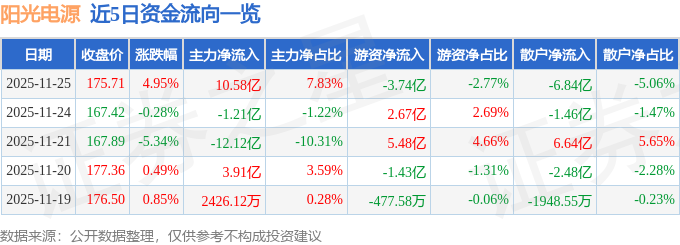 证券之星消息,截至2025年11月25日收盘,阳光电源(300274)报收于175.71元,上涨4.95%,换手率4.86%,成交量77.23万手,成交额135.13亿元。