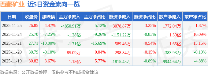 证券之星消息,截至2025年11月25日收盘,西藏矿业(000762)报收于26.85元,上涨4.47%,换手率6.9%,成交量35.92万手,成交额9.47亿元。