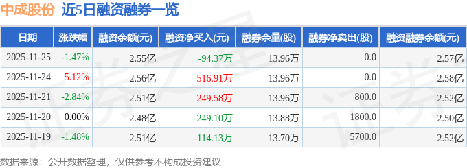 中成股份融资融券信息显示,融资方面,当日融资买入974.73万元,融资偿还1069.1万元,融资净偿还94.37万元。融券方面,融券卖出0.0股,融券偿还0.0股,融券余量13.96万股,融券余额177.85万元。融资融券余额2.57亿元。