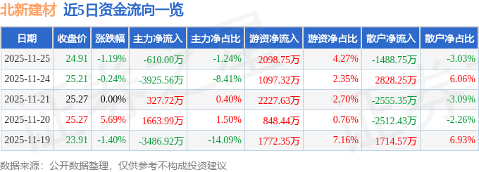 证券之星消息,截至2025年11月25日收盘,北新建材(000786)报收于24.91元,下跌1.19%,换手率1.17%,成交量19.75万手,成交额4.92亿元。