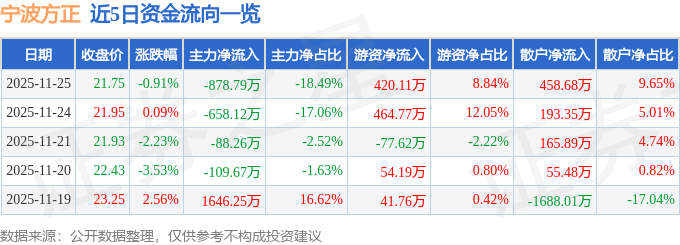 11月25日的资金流向数据方面,主力资金净流出878.79万元,占总成交额18.49%,游资资金净流入420.11万元,占总成交额8.84%,散户资金净流入458.68万元,占总成交额9.65%。