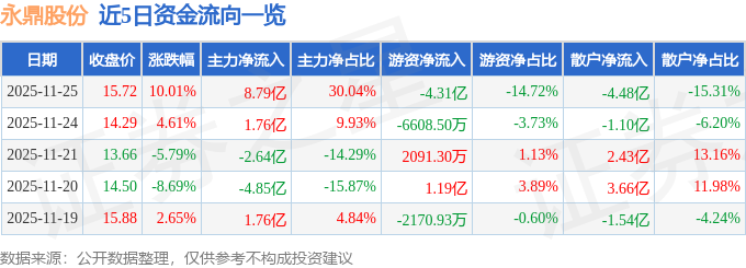 11月25日的资金流向数据方面,主力资金净流入8.79亿元,占总成交额30.04%,游资资金净流出4.31亿元,占总成交额14.72%,散户资金净流出4.48亿元,占总成交额15.31%。