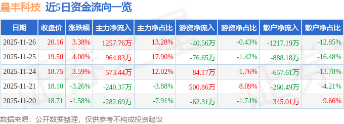 证券之星消息,截至2025年11月26日收盘,晨丰科技(603685)报收于20.16元,上涨3.38%,换手率2.32%,成交量4.66万手,成交额9470.05万元。