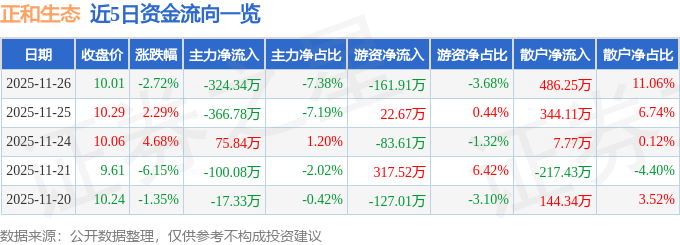 证券之星消息,截至2025年11月26日收盘,正和生态(605069)报收于10.01元,下跌2.72%,换手率5.13%,成交量4.32万手,成交额4397.71万元。