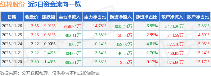 证券之星消息,截至2025年11月26日收盘,红棉股份(000523)报收于3.55元,上涨9.91%,涨停,换手率9.39%,成交量124.46万手,成交额4.37亿元。