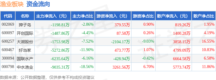 从资金流向上来看,当日渔业板块主力资金净流出2.5亿元,游资资金净流入1669.36万元,散户资金净流入2.33亿元。渔业板块个股资金流向见下表: