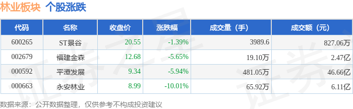 证券之星消息,11月26日林业板块较上一交易日下跌5.91%,永安林业领跌。当日上证指数报收于3864.18,下跌0.15%。深证成指报收于12907.83,上涨1.02%。林业板块个股涨跌见下表: