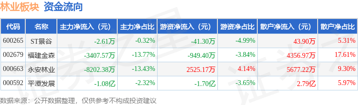 从资金流向上来看,当日林业板块主力资金净流出2.24亿元,游资资金净流出1.55亿元,散户资金净流入3.79亿元。林业板块个股资金流向见下表: