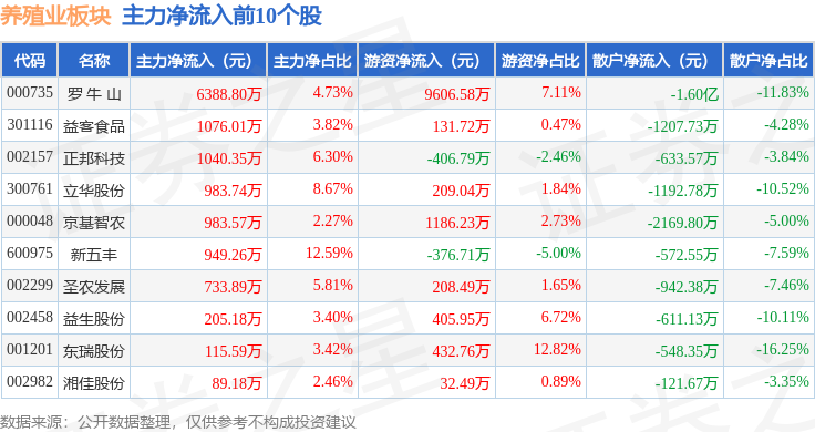 从资金流向上来看,当日养殖业板块主力资金净流出3008.28万元,游资资金净流入1.56亿元,散户资金净流出1.26亿元。养殖业板块个股资金流向见下表: