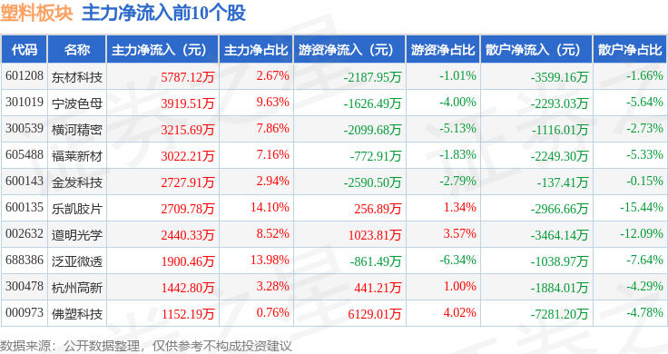 从资金流向上来看,当日塑料板块主力资金净流出9164.75万元,游资资金净流入7246.55万元,散户资金净流入1918.2万元。塑料板块个股资金流向见下表: