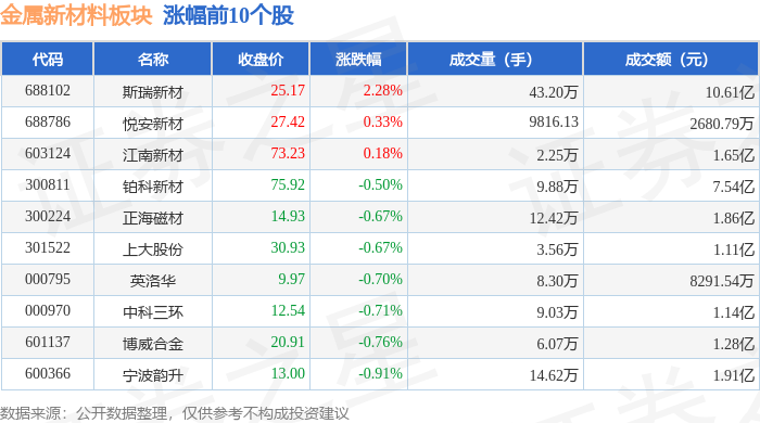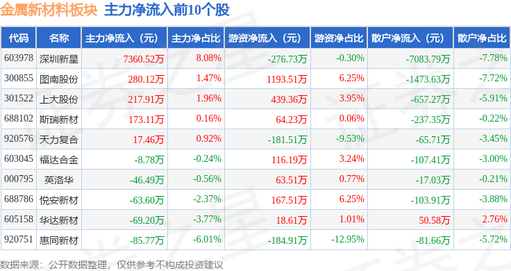 从资金流向上来看,当日金属新材料板块主力资金净流出3.01亿元,游资资金净流出9104.84万元,散户资金净流入3.92亿元。金属新材料板块个股资金流向见下表: