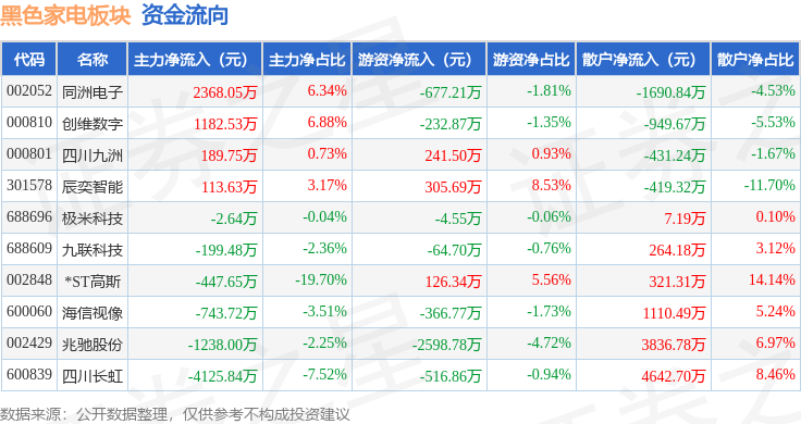 从资金流向上来看,当日黑色家电板块主力资金净流出2903.37万元,游资资金净流出3788.21万元,散户资金净流入6691.58万元。黑色家电板块个股资金流向见下表: