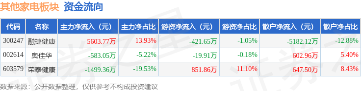 从资金流向上来看,当日其他家电板块主力资金净流入3521.36万元,游资资金净流入410.3万元,散户资金净流出3931.66万元。其他家电板块个股资金流向见下表: