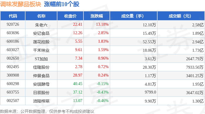 证券之星消息,11月26日调味发酵品板块较上一交易日下跌0.4%,宝立食品领跌。当日上证指数报收于3864.18,下跌0.15%。深证成指报收于12907.83,上涨1.02%。调味发酵品板块个股涨跌见下表: