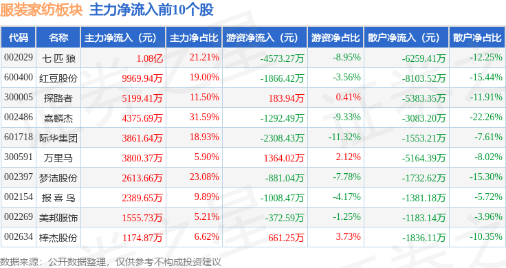 从资金流向上来看,当日服装家纺板块主力资金净流入3.4亿元,游资资金净流出1.07亿元,散户资金净流出2.33亿元。服装家纺板块个股资金流向见下表: