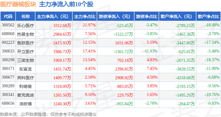 从资金流向上来看,当日医疗器械板块主力资金净流出3.71亿元,游资资金净流入3.27亿元,散户资金净流入4354.7万元。医疗器械板块个股资金流向见下表: