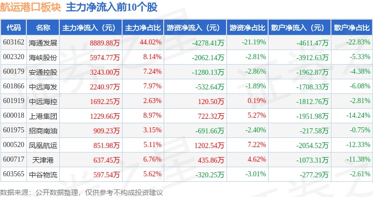 从资金流向上来看,当日航运港口板块主力资金净流入1.43亿元,游资资金净流出1027.58万元,散户资金净流出1.33亿元。航运港口板块个股资金流向见下表: