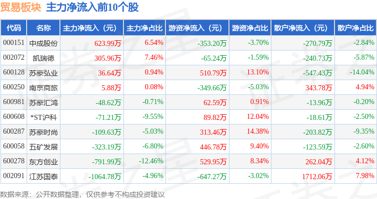 从资金流向上来看,当日贸易板块主力资金净流出6972.16万元,游资资金净流入2146.47万元,散户资金净流入4825.69万元。贸易板块个股资金流向见下表: