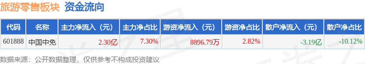 从资金流向上来看,当日旅游零售板块主力资金净流入2.3亿元,游资资金净流入8896.79万元,散户资金净流出3.19亿元。旅游零售板块个股资金流向见下表: