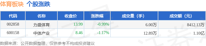 证券之星消息,11月26日体育板块较上一交易日下跌1.13%,中体产业领跌。当日上证指数报收于3864.18,下跌0.15%。深证成指报收于12907.83,上涨1.02%。体育板块个股涨跌见下表: