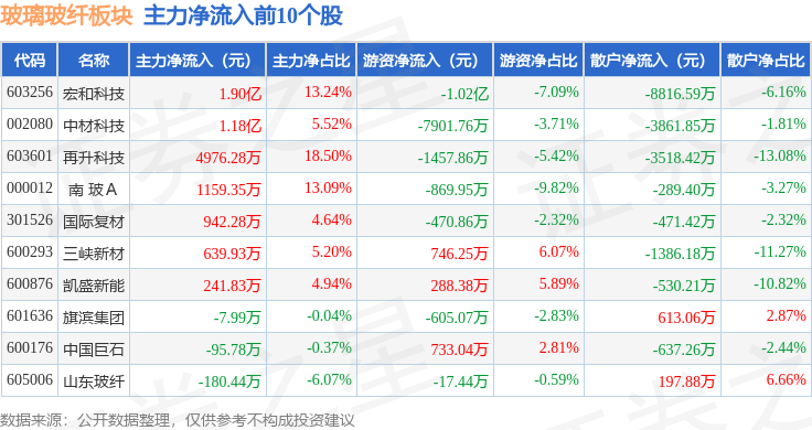 从资金流向上来看,当日玻璃玻纤板块主力资金净流入3.46亿元,游资资金净流出1.75亿元,散户资金净流出1.71亿元。玻璃玻纤板块个股资金流向见下表: