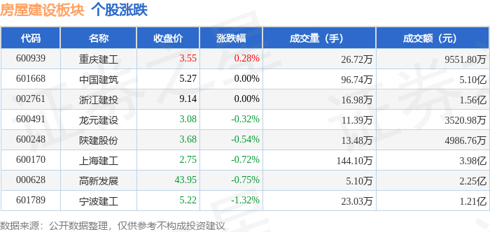 证券之星消息,11月26日房屋建设板块较上一交易日下跌0.13%,宁波建工领跌。当日上证指数报收于3864.18,下跌0.15%。深证成指报收于12907.83,上涨1.02%。房屋建设板块个股涨跌见下表: