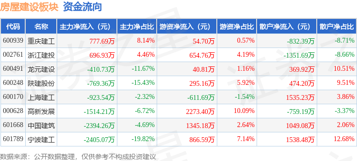 从资金流向上来看,当日房屋建设板块主力资金净流出6942.55万元,游资资金净流入4918.91万元,散户资金净流入2023.65万元。房屋建设板块个股资金流向见下表: