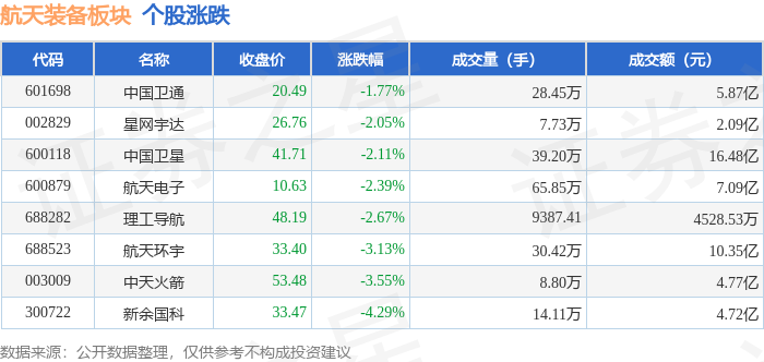 证券之星消息,11月26日航天装备板块较上一交易日下跌2.21%,新余国科领跌。当日上证指数报收于3864.18,下跌0.15%。深证成指报收于12907.83,上涨1.02%。航天装备板块个股涨跌见下表: